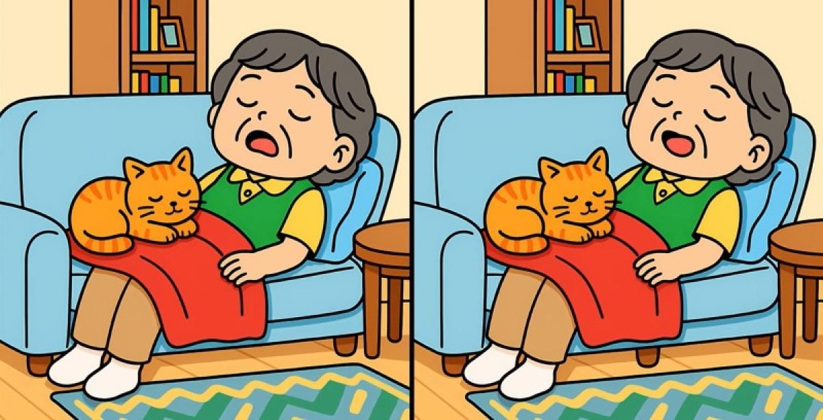 Készen állsz a tesztelésre? Íme két illusztráció: egy nőt és egy macskát ábrázolnak, akik egy kanapén alszanak. Első pillantásra a jelenetek teljesen egyformának tűnnek, de három apró különbség van köztük.