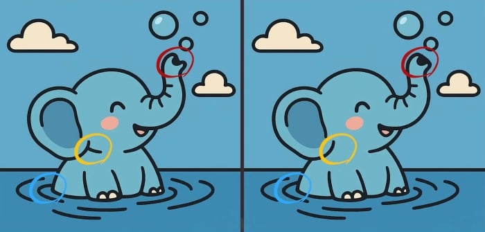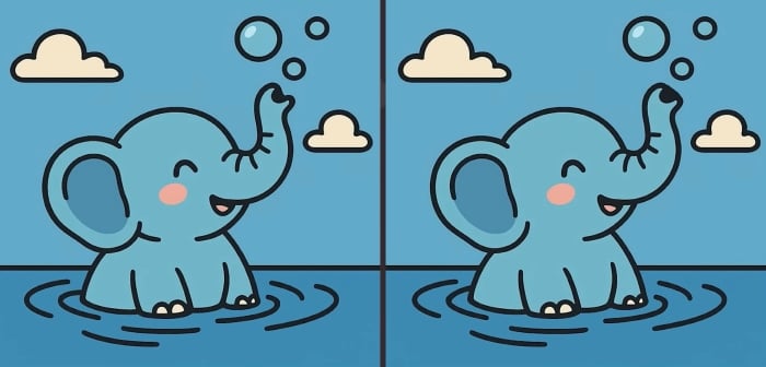 Előtted két kép van, amelyeken egy vízben játszó elefánt látható. Első pillantásra teljesen egyformának tűnnek, de ez csak illúzió. Három apró különbség van a képekben elrejtve.