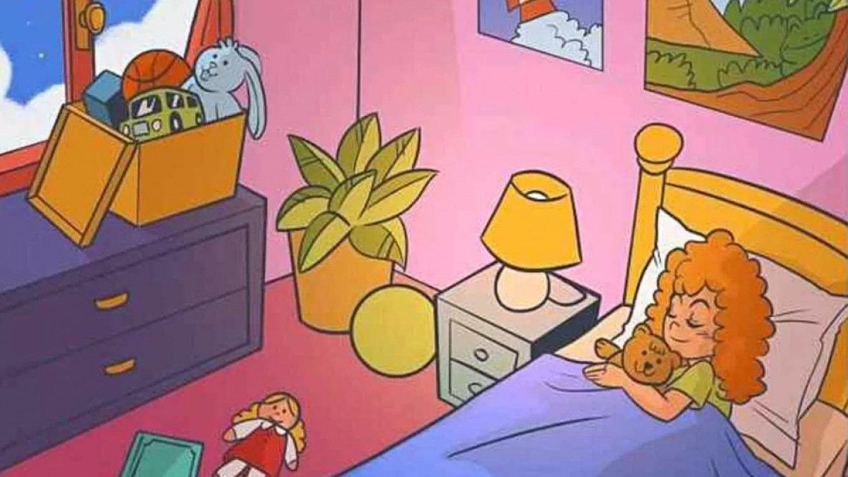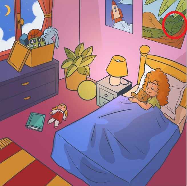A képen egy lány látható, aki a hálószobájában alszik. Egy plüssmacit ölelget, tőle jobbra egy baba, egy füzet, a sarokban a szekrényen pedig egy doboz van egyéb játékokkal. A feladatod az, hogy megtaláld, hol van a béka. Elég közel rejtőzik.