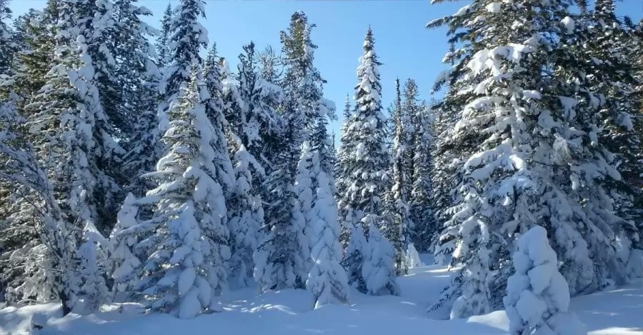 A képen egy téli tűlevelű erdő látható. A fák annyira hófödteek, hogy a legtöbbnek még az ágai is lefelé hajlanak a téli hópelyhek súlyától. A talajt is vastag hótakaró fedi.