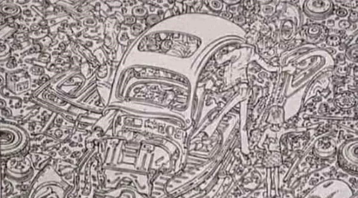 A képen – egy férfi ül egy garázsban, ahol rengeteg alkatrész van. Középen egy szétszedett autó áll, a férfi mellett pedig – látszólag – a felesége, aki hazahívni jött. A feladatunk az, hogy találjunk itt egy macskát.